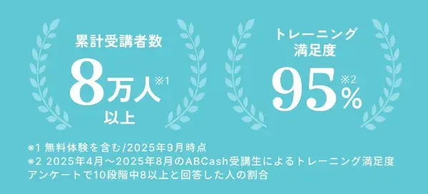 ABCashは、利用者がどんどん増えていて、累計受講者数がなんと8万人以上利用者アンケートでは95%もの人が満足しているサービスだよ✨