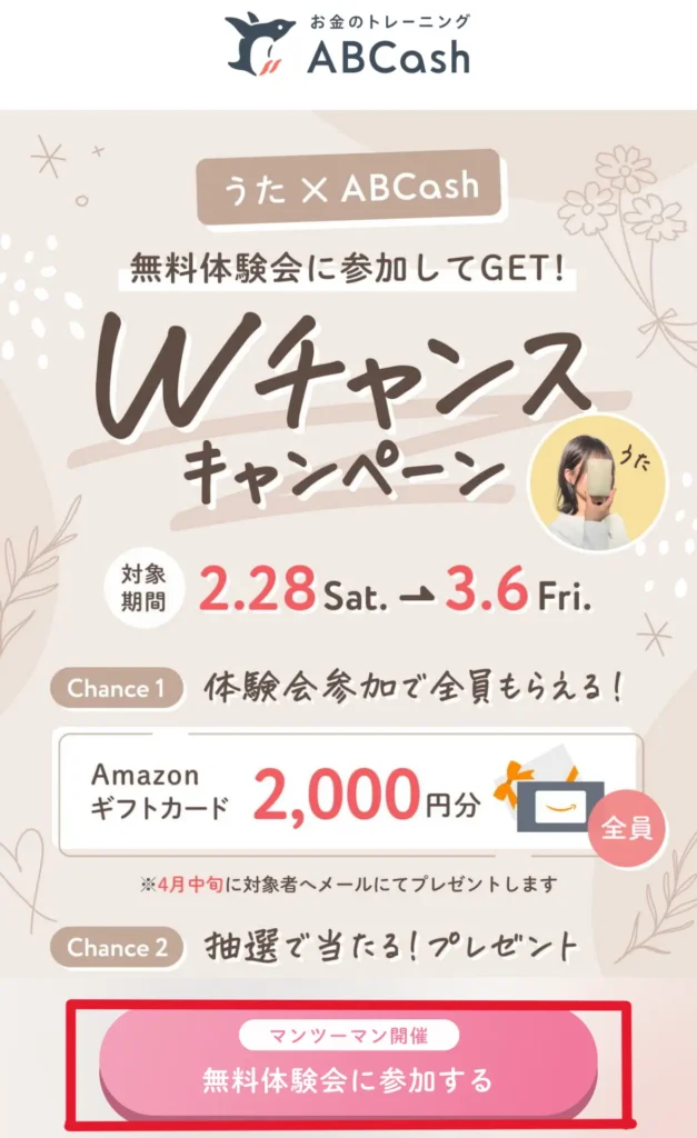 「本気でお金の悩みを解決したい!」という方だけにうたオリジナル特典をお渡ししたいので、ABCashの無料体験を受けて、1歩踏み出した方へプレゼントさせてもらいます🎁